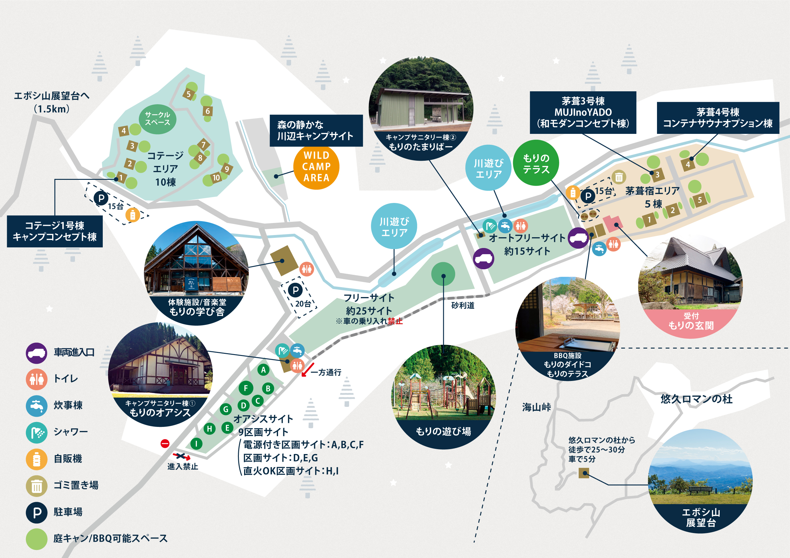 | 料金 | 区画 定員 料金(税込み) A、B、C(電源有、直火不可) 5名 4,500円 D、E、G(電源無、直火不可) 5名 4,000円 F (電源有、直火不可) 8名 6,500円 H、I (電源無、直火可) 5名 5,000円 定員超過 大人500円/人 小学生以下250円/人 |
